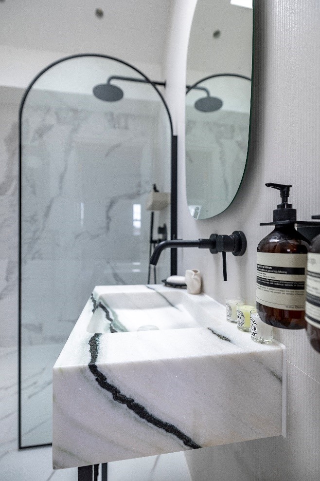 The central bathroom area in a wellness suite often includes sensory rainfall showers, steam showers and natural stone basins. The emphasis is on relaxing sensory immersion, rather than a quick essential shower.