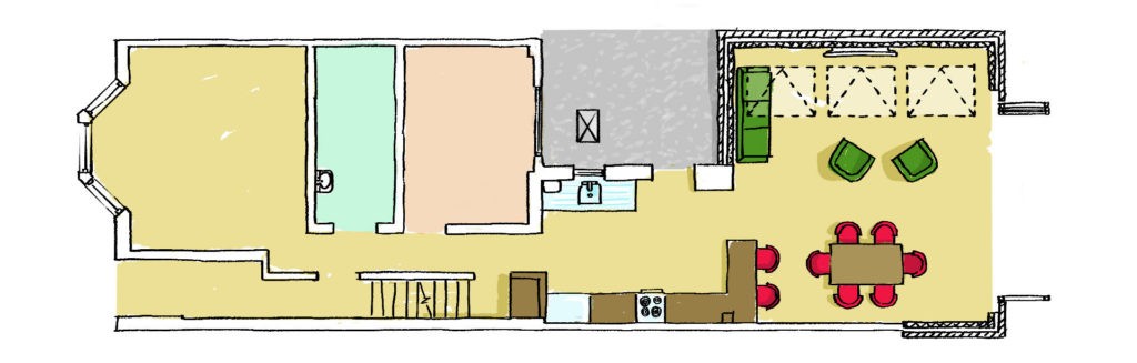 Your choices are endless when it comes to designing your extension, and we’re going to talk you through some of our most popular schemes. When thinking about your design, you can either just focus on the extension area and how it will affect that rear room. The alternative option is to look at your entire ground floor area, and think about how you want your extension to interact with the front room, corridor and that middle room.