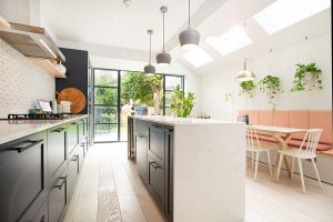 Once you have made the decision to build a side return extension, it’s important to think about the layout of your kitchen.  Modern kitchens are now the heart of the home, and are no longer just used for food preparation, but also for eating, entertaining and relaxing. When considering your design, bear in mind your needs as well as the dimensions you have available.