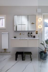 Popular additions include stone-like tiles, limewashed walls and brushed brass or matt black taps. Fluted finishes, textured and t ceramics and timber accents are all popular. Contrasting textures can work really well, for example, smooth porcelain paired with warm-coloured timber, which adds character richness to the room.